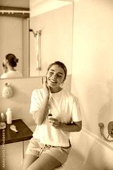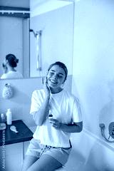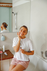 Beautiful young woman applying cosmetic serum onto her face in bathroom. Facial Skincare