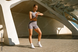 Young woman in sportswear looking on smartwatch before exercising. Outdoor sports in the morning