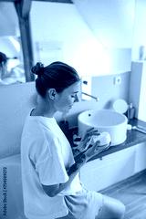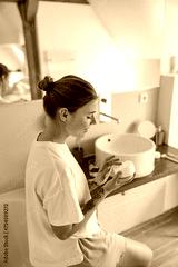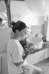 Beautiful woman taking care of skin by applying moisturizer cream in bathroom