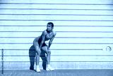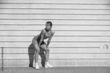 Smiling woman in sportswear have a rest after workout outside standing on wall background