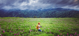 Asian woman travel nature. Travel relax. Photography Cucumber sessilis flower field.