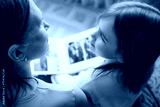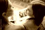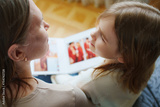 mother and daughter flips through a book with photos of dad and pregnant mom.