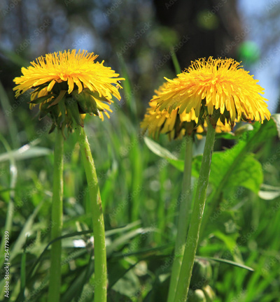 Large blooming dandelions in green grass. Blossoming yellow flowers in thick grass on a meadow. Beautiful, yellow, spring flowers. Taraxacum or dandelion - perennial herbaceous plant of Astrov family