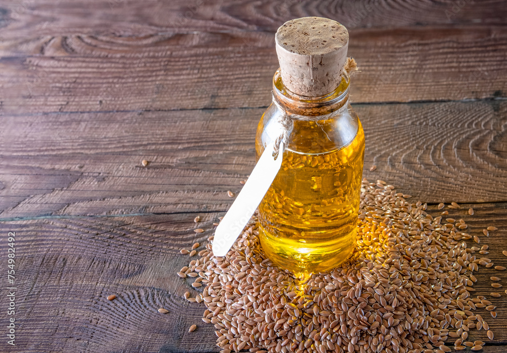 Flax seeds and a bottle of linseed oil on a wooden background. An alternative source of omega 3 vitamins and fats