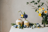 Happy Easter! Stylish easter eggs, homemade easter bread and spring flowers on linen napkin on rustic table. Natural painted marble eggs, daffodils bouquet and holiday food. Modern still life