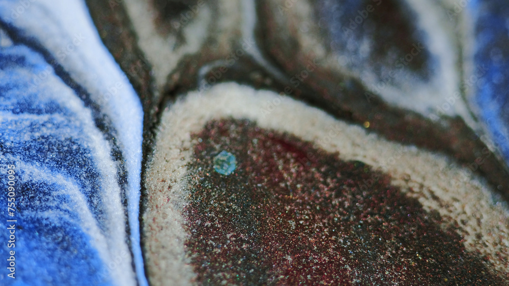 Paint spill. Glitter ink drip. Defocused blue red bronze white color shiny shimmering particles bokeh light texture fluid wave cascade abstract art background.