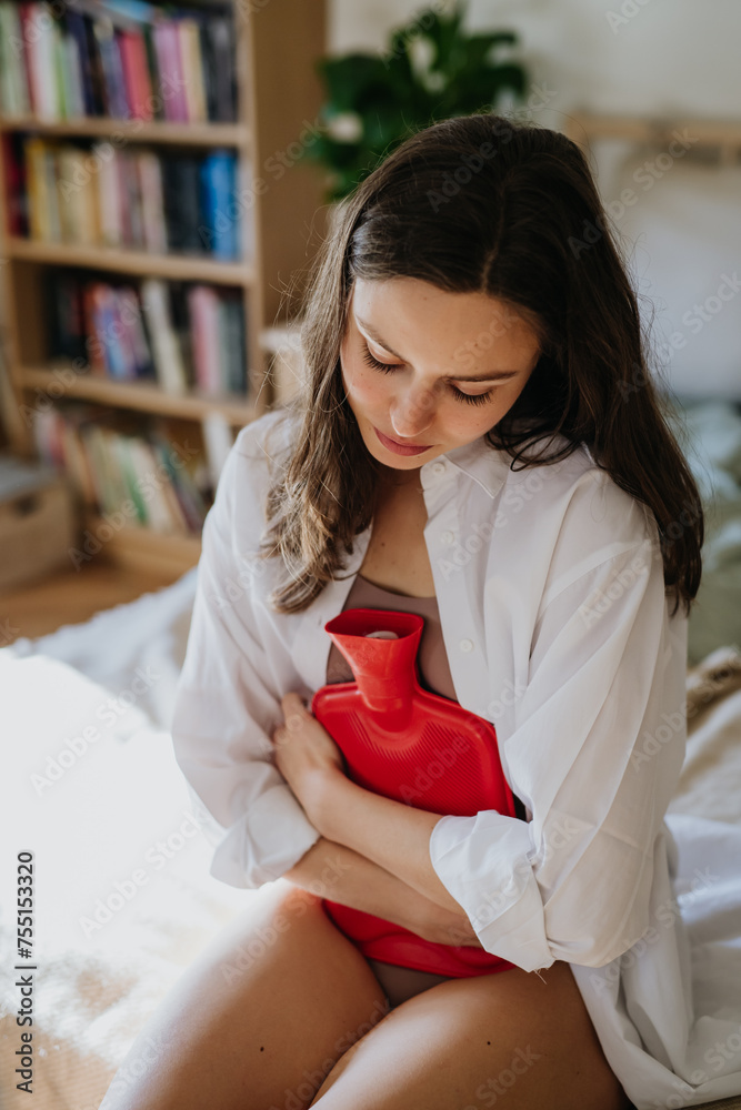 Woman at home suffering from menstrual pain, having cramps. Woman warming lower abdomen with a hot water bottle, endometriosis, and conditions causing pain in tummy.