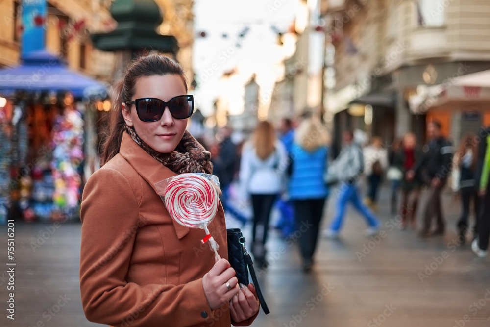 Girl standing and holding a lollipop in the city