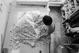 Top view of a female tailor cutting fabric on the floor of a busy sewing workshop.