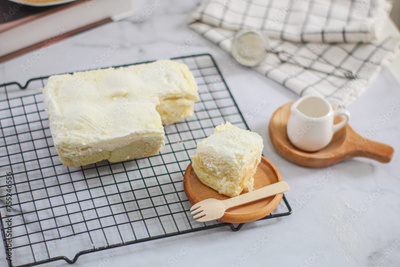 Milk Bun Thailand is a soft bread with a topping of powdered sugar, milk and vla filling, soft focus texture, served on black tray and cup of tea with a piece of milk bun. makanan viral indonesia