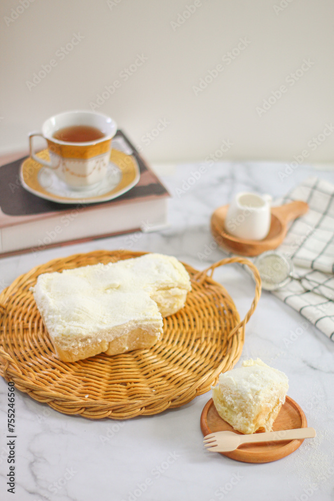 Milk Bun Thailand is a soft bread with a topping of powdered sugar, milk and vla filling,soft focus texture, served on rattan tray and cup of tea with a piece of bun. makanan viral indonesia
