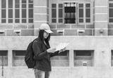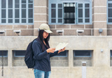 Asian young woman traveler backpack looking maps brochure at museum. Female travel passenger by plane tourist baggage. Happy Tourism trip women journey on vacation. Relax women walking in old town.