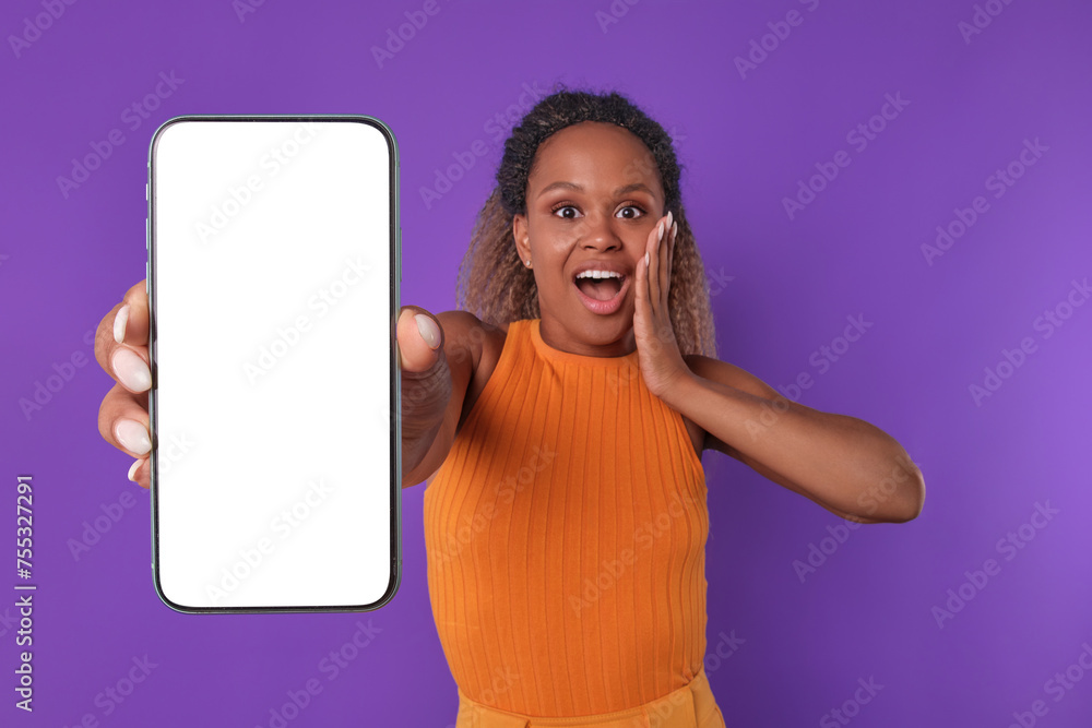 Young attractive shocked African American woman with mobile phone in hand opens mouth after reading unexpected news and experiences wow emotions stands posing in purple studio. White screen