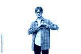 handsome red-haired caucasian student guy in glasses dressed in a plaid shirt shows a heart