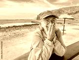 Cheerful attractive senior gray haired woman at beach looks in camera laughing covering her mouth with hands enjoying freedom and retirement, horizon over water in background