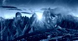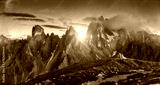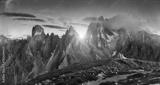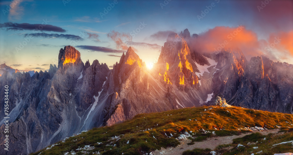 Famous rocky massif Cadini di Misurina range in National Park Tre Cime di Lavaredo. Sexten Dolomiti, South Tyrol, Europe.