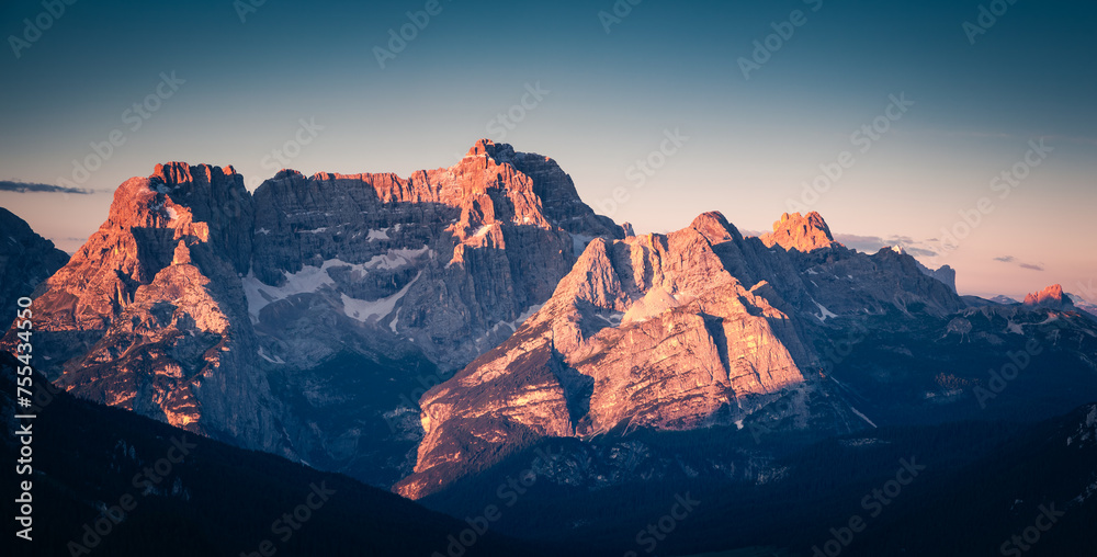 A splendid view of mighty rocks in the Italian Alps. National Park Tre Cime di Lavaredo, Italy, South Tyrol.