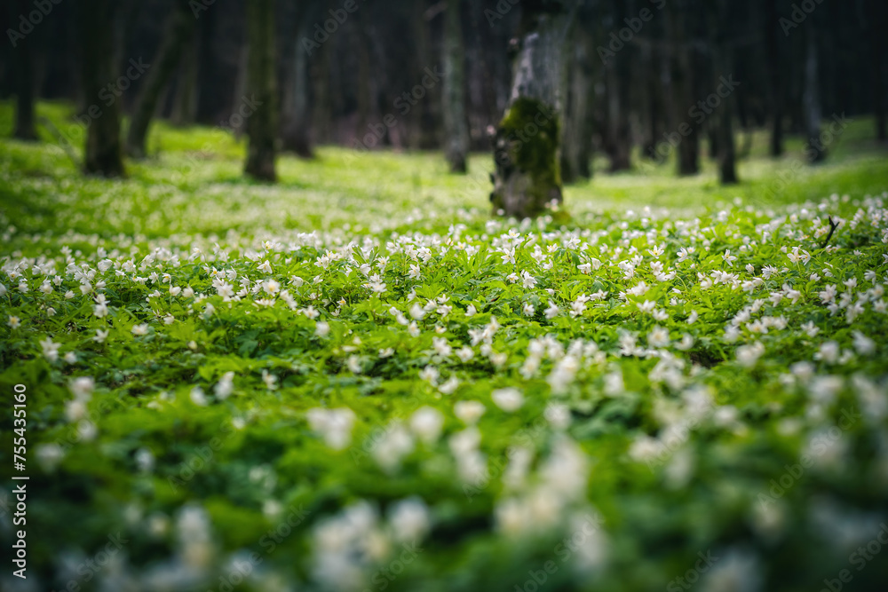 A magical flower meadow in a spring forest.