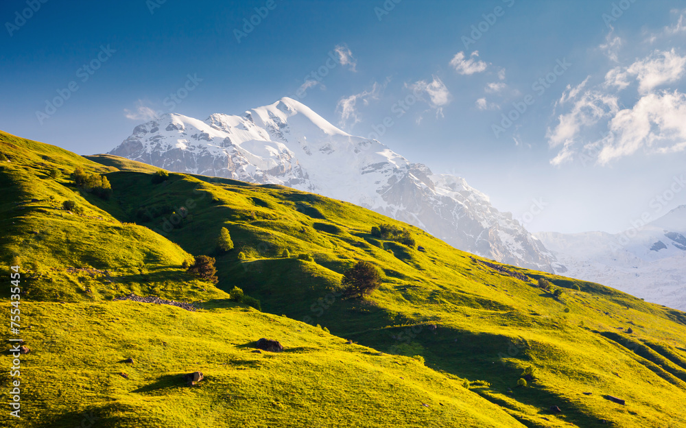 An incredible view of the snow-capped peak of the Main Caucasus Range. Upper Svaneti region, Georgia.