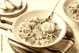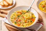 Dinner with chicken noodle soup in a white plate, on a wooden board. Beige table surface.