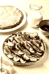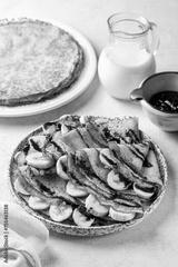 Homemade gluten-free crepes made with rice flour. Served with banana and chocolate sauce on a beige table surface. Milk and jam on background. Breakfast time. Vertical image.