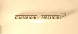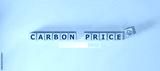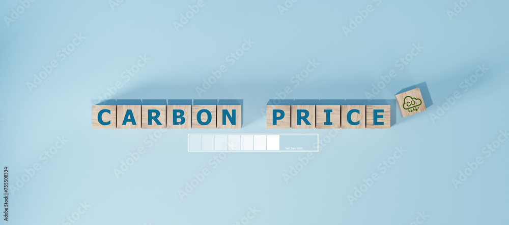Word "CRABON PRICE" spelled out in blue text on wooden blocks. net zero concept. environment