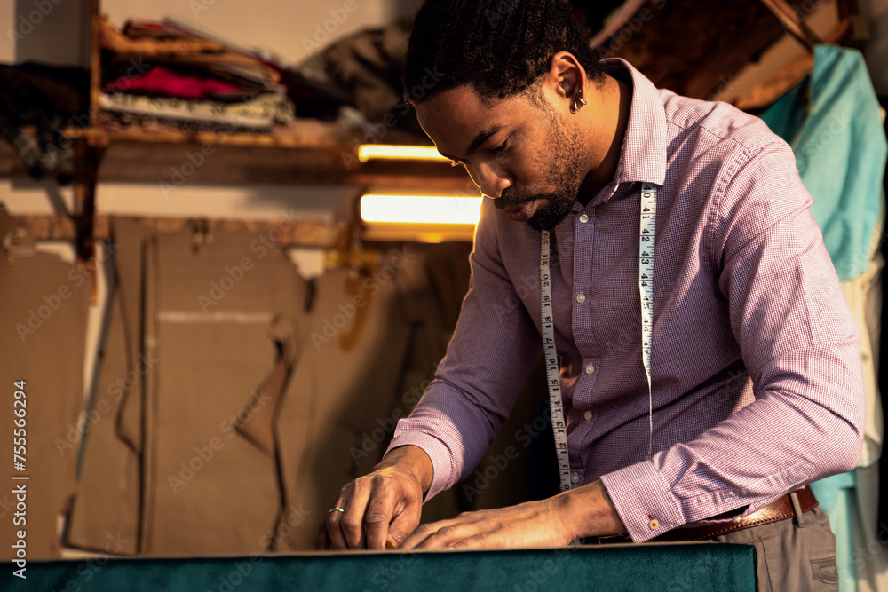 Male fashion tailor working on the measurements for the suit design in his workshop.