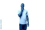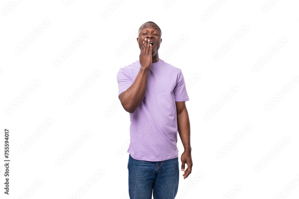 young smart african man dressed in a lilac t-shirt and jeans thinking on a white background