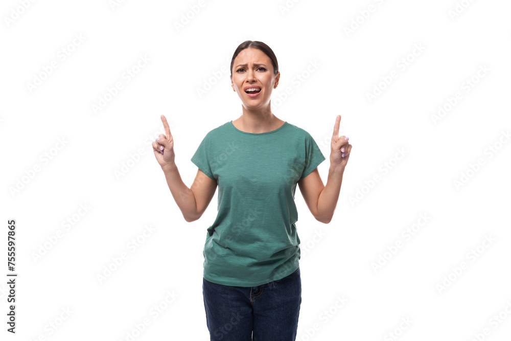 young emotional brunette woman in a t-shirt and jeans points with her hand to the presence of advertising