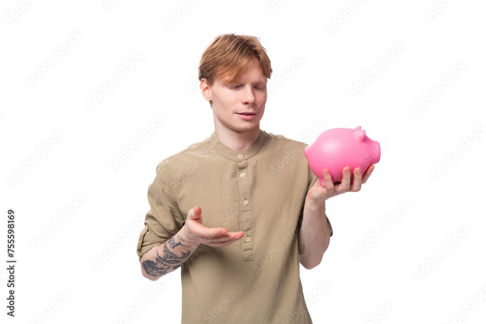 young cute caucasian guy with red hair decides where to spend his savings