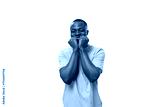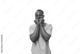 close-up portrait of a young laughing african man in a lilac t-shirt making a grimace