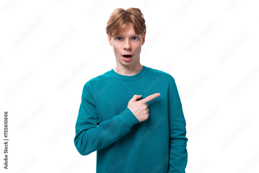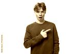 a young guy with short red hair dressed in a blue pullover points his hand to the side