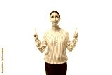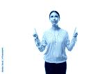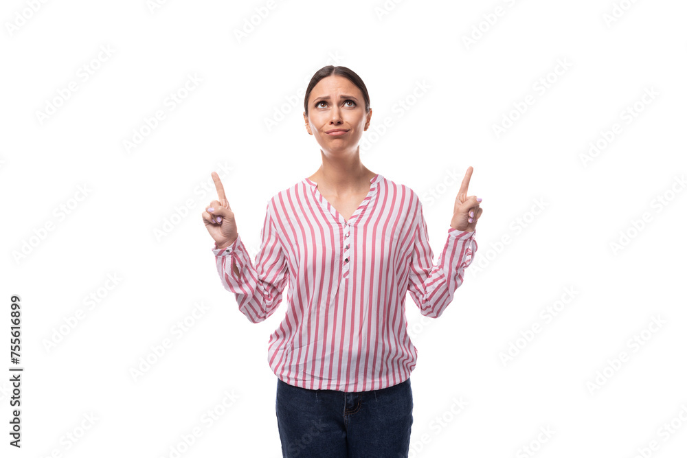 young brunette office worker woman dressed in a shirt points with her hands to the space for advertising