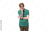 young stylish man with red hair looks thoughtfully at the camera and thinks about an idea