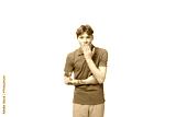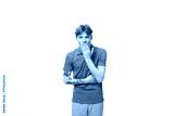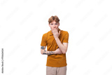 young smart guy with red hair stands thoughtfully on a white background with copy space