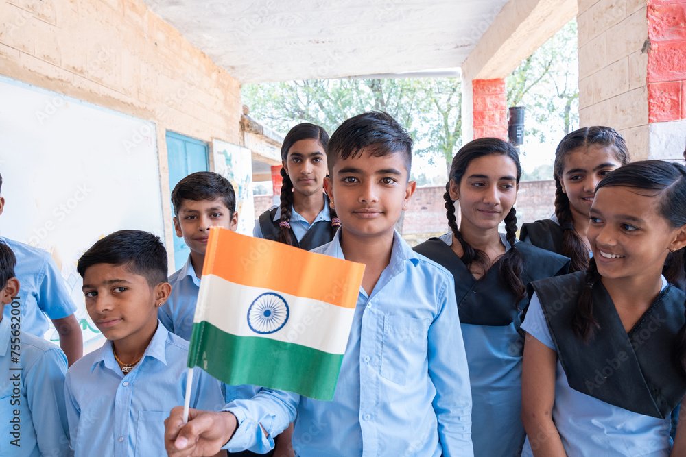 Group of happy village children in school uniform celebrating independence day with Indian flag in hand - concept of independence, republic day, patriotism and freedom.