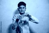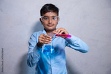 Happy Young Indian boy in school uniform wearing safety lab goggles while working on his chemistry project experiment with test tube and conical flask in hand - concept of education.