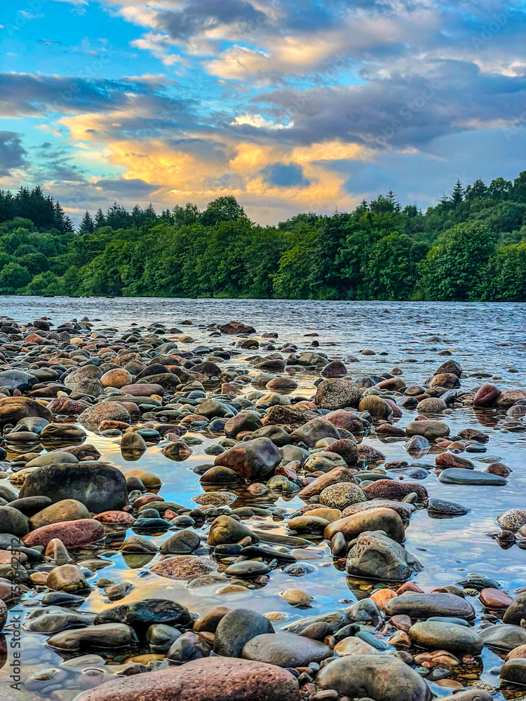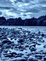 Banks of wide flowing River Nevis strewn with greyish and reddish pebble stones