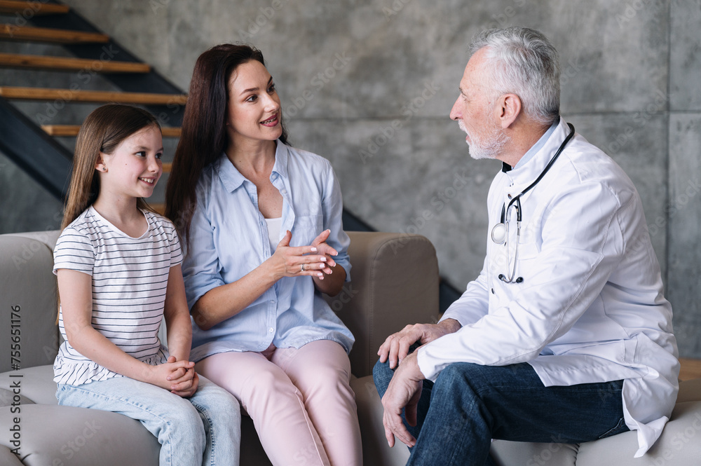 Family doctor talking to mother and child during home visit.
