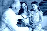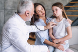 Pediatrician checking up patient girl using stethoscope during home visit