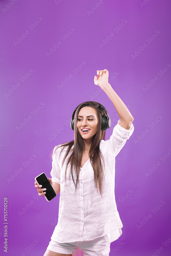 Beautiful young woman in wireless headphones listening to music using mobile phone and dancing on purple background. Girl uses wireless earphones