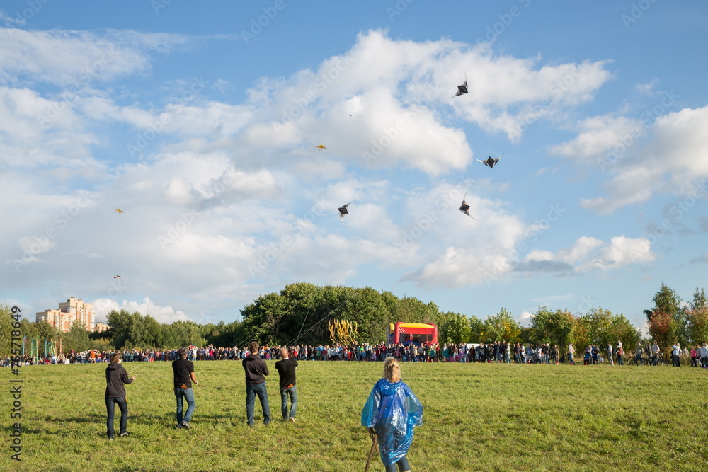 Many people launch kites in city park at summer sunny day