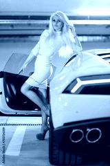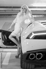 Slim blonde woman in yellow dress stands leaning elbow on roof of modern white car at underground parking