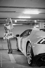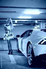 Young blonde woman in flowery dress and blue high-heel shoes stands near modern white car at underground parking