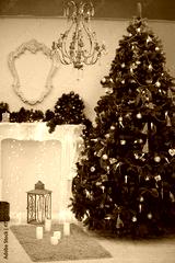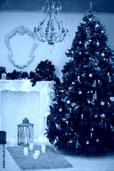 Christmas tree is standing near vintage fireplace in studio