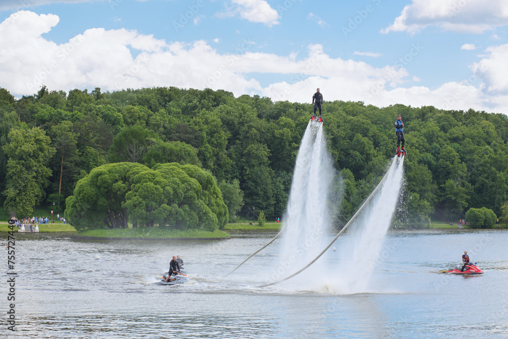 Aquabike show at the festival of fire and rescue service in the park Tsaritsyno