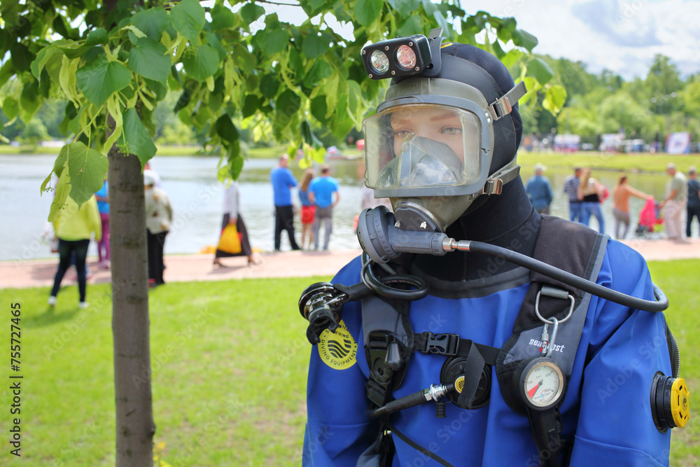 Mannequin dressed rescuer on water at the festival of fire and rescue service in the park