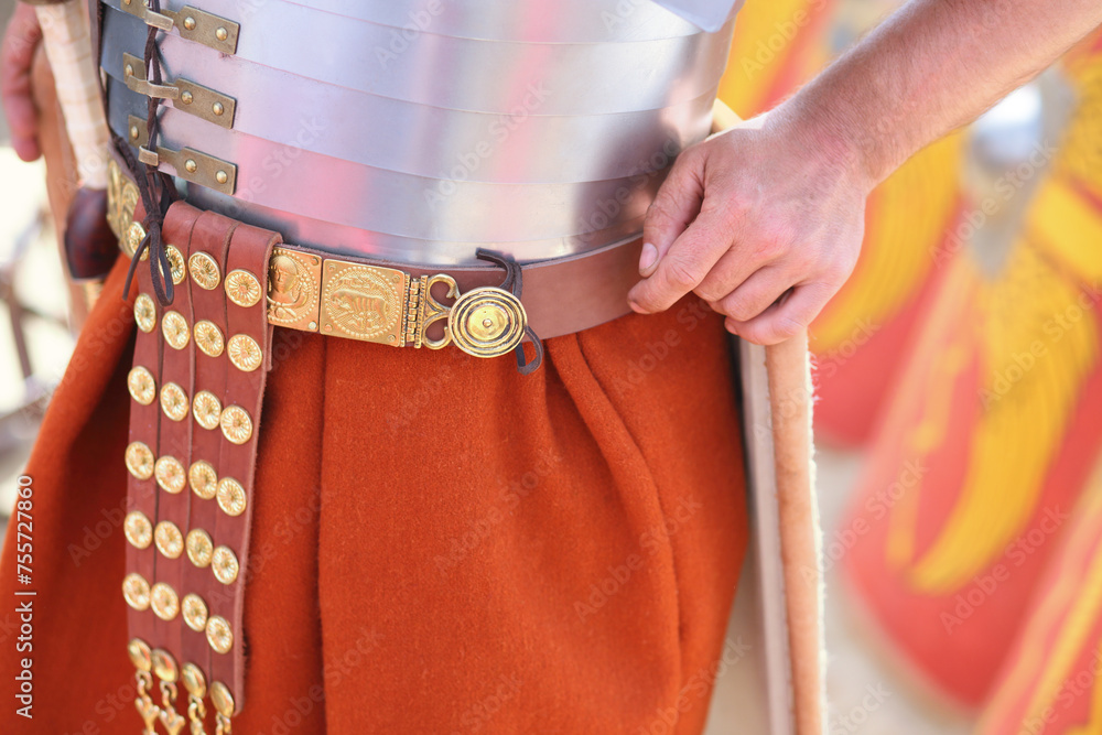 Leather belt with protective plaques at the waist Roman soldier at the festival Times and epoch: Ancient Rome in Kolomenskoye
