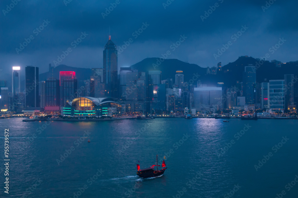 Evening high skyscrapers, river shore and ships in Hong Kong, China, view from Starhouse