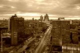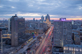 New Arbat Street, highway with moving cars, skyscrapers at evening in Moscow, Russia